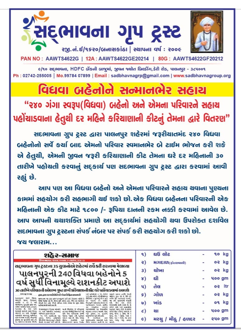 “ ૨૪૦ ગંગા સ્વરૂપ (વિધવા) બહેનો અન એમના પરિવાર ને સહાય પહોચાડવા હેતુ થી દર મહીને કરિયાણા ની કીટનું તેમના દ્વારે વિતરણ ”