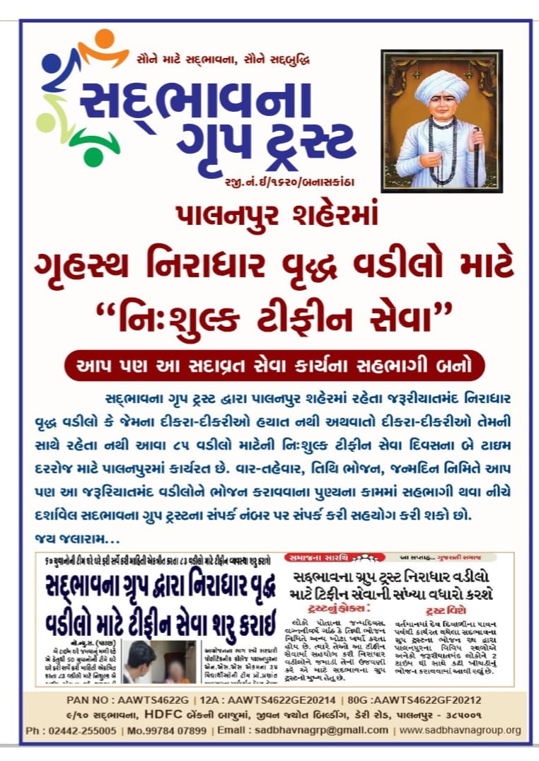 જેમને પોતાના માતા પિતાને તરછોડ્યા છે એવા વડીલો અથવાતો સંજોગોવસાત એકલા રહેવા મજબુર બન્યા છે એવા વડીલો માટેની ભોજન વ્યવસ્થા સદભાવના ગ્રુપ ટ્રસ્ટ દ્વારા શરૂ થવા જઇ રહી છે...